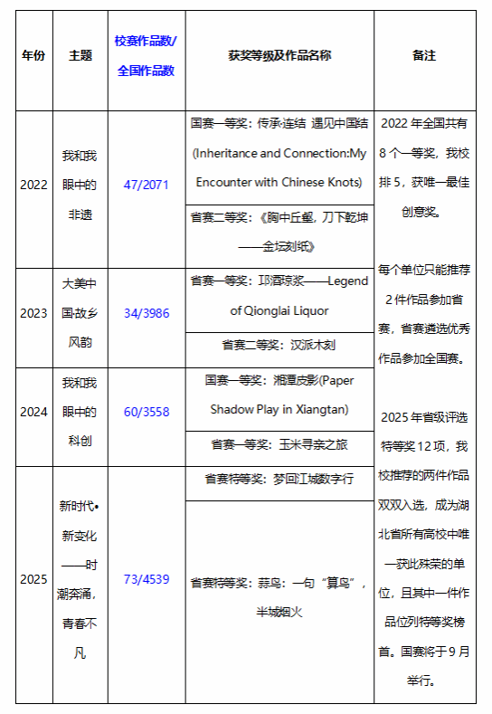 我校在此项赛事中表现突出,充分体现了“组织有力、指导专业和竞争强劲”的特点。数据显示,活动征集作品数量从2022年的47件稳步增长至2025年的73件,参与人数也从超100人显著提升至250人以上,覆盖全校所有学院,显示出广泛的组织动员能力和学生参与热情。指导教师团队精准发力,为作品打磨提供专业指导;赛事成绩屡创新高 —— 连年斩获全国一等奖、最佳创意短片、湖北省特等奖等荣誉,2025 年更成为全省唯一包揽两项省赛特等奖的高校,其中一件作品位列特等奖榜首,充分彰显了我校的育人质量与竞争实力。无论是作品数量还是作品质量,我校都具有显著的优势。